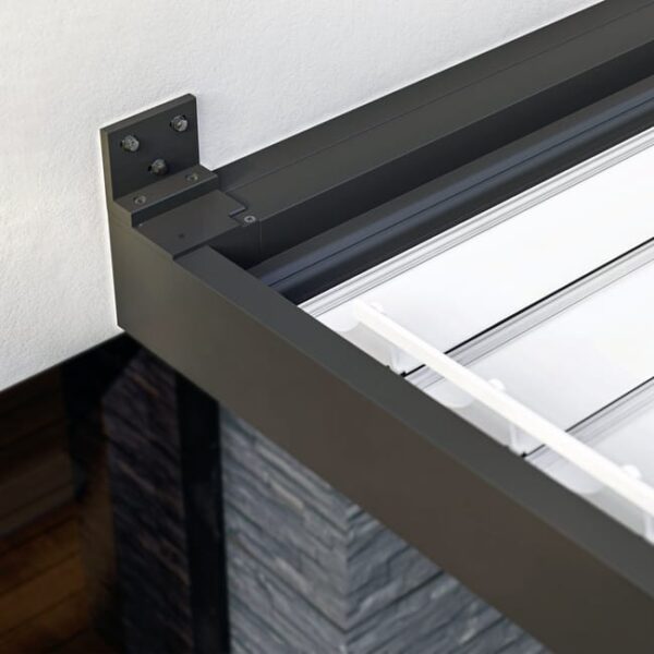 Pergola bioklimatyczna Génova przyścienna – 4,06 × 3,12 m, kolor szary z białymi lamelami